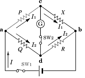 4개의 저항이 다이아몬드 철교의 형태를 이루는 것으로 PR = QX 평형 조건이 성립하면 즉 c-d 구간을 기준으로 대칭형이 되면 c-d구간은 전위가 0이 되어 전류가 흐르지 않고 검류계 G는 0을 0을 가리키게 됩니다. 평형 조건 상태에서 미지의 X를 구하는 공식은 다음과 같습니다.