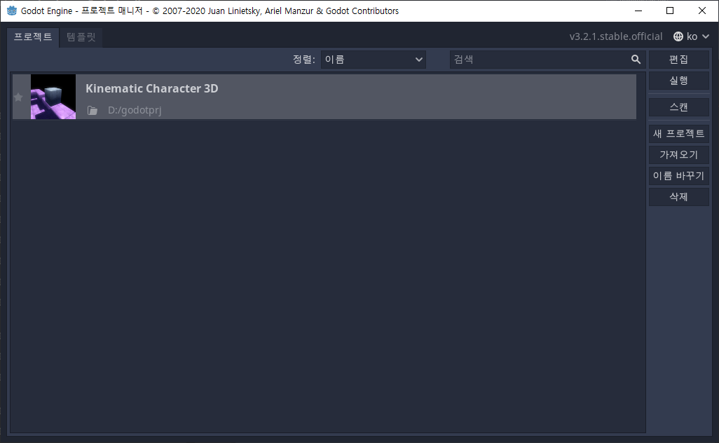 고도 프로젝트를 저장한 폴더를 보면 위의 그림처럼 project.godot라는 프로젝트 파일이 있는데 저 파일을 보고 [스캔]에서 프로젝트를 자동 등록해 주는 것이다. 마찬가지로 [가져오기]를 선택하면 프로젝트 매니저에 등록되지 않은 프로젝트의 폴더를 선택하여 매니저에 등록하면서 바로 편집할 수 있게 해 준다. 이 화면에 중요한 인터페이스가 하나 있는데 우측 상단에 있는 언어 선택 버튼으로 고도 편집기가 한국어 지원을 하고 있지만 번역이 애매하거나 이해가 안되는 경우에는 영어로 바꾸어서 작업을 진행할 수도 있다. 물론 언어를 바꾸면 편집기를 재실행해야 한다.