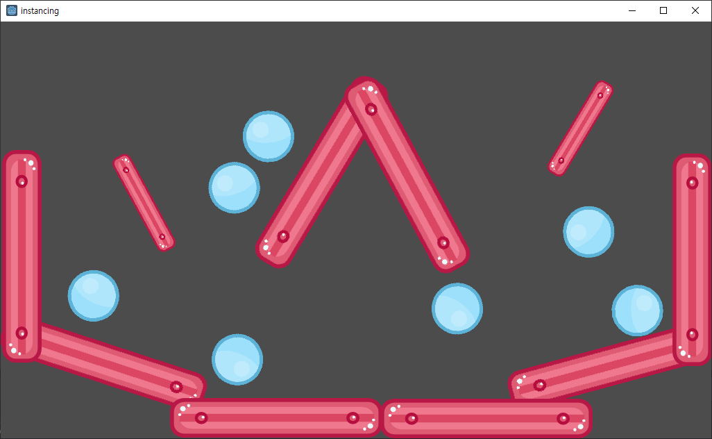 위의 좌측 그림은 볼을 개체화하고 복제 및 위치를 조정한 이후의 편집기 모습이고 우측은 이 상태에서 게임을 실행한 화면이다.