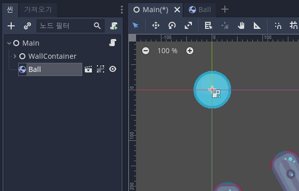 개체화(인스턴스화) 화면이 나오면 Ball.tscn을 더블클릭하거나 선택하고 하단의 [열기]를 누른다. 그러면 우측의 그림처럼 볼 씬이 개체화되는데 x, y 위치가 0, 0으로 2D 편집기에서 개체의 중심이 수평, 수직 가이드라인의 교차점에 있는 것을 확인할 수 있다. 마우스로 드래그해서 적당한 위치로 옮기거나 인스펙터 창에서 값을 직접 입력하는 것으로 위치, 크기 각도 등을 수정할 수 있다.