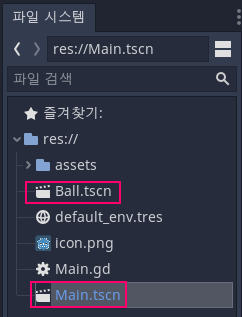 이 예제에는 벽들을 배치한 Main 씬과 Ball 씬 두 가지가 있으며 파일 시스템 창에서 해당 씬을 더블 클릭하면 편집기에서 확인 및 수정할 수 있다.
