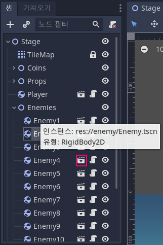 씬 창에서 일반적인 노드위에 마우스를 올려두면 좌측 그림의 "유형:Node2D"와 같은 형태로 노드의 유형을 표시한다. 그렇지만 어떤 씬의 인스턴스인지와 유형을 우측의 그림처럼 표시하는 것이 바로 인스턴스이다. 그림에서 확인할 수 있듯이 원본 씬인 Enemt.tscn을 여러 개의 노드로 개체화시킨 모습이다. 결국 씬을 인스턴스의 형태로 다른 씬의 노드로 포함시키는 것이 가능하다는 것이다. 씬이라는 원본 도장이 있으면 인스턴스라는 사본 찍어내기가 가능한 것이다. 인스턴스를 통해서 게임의 흐름이나 사용자 인터페이스 조차도 노드화 시키는 방식으로 조직화할 수 있다. 이런 방식은 개발자에게 하나의 씬을 다양한 레벨과 방식으로 쪼갤 수 있는 여지를 부여하므로 협업과 분업이 가능해지고 코드의 재사용성도 높여주는 장점이 있다.