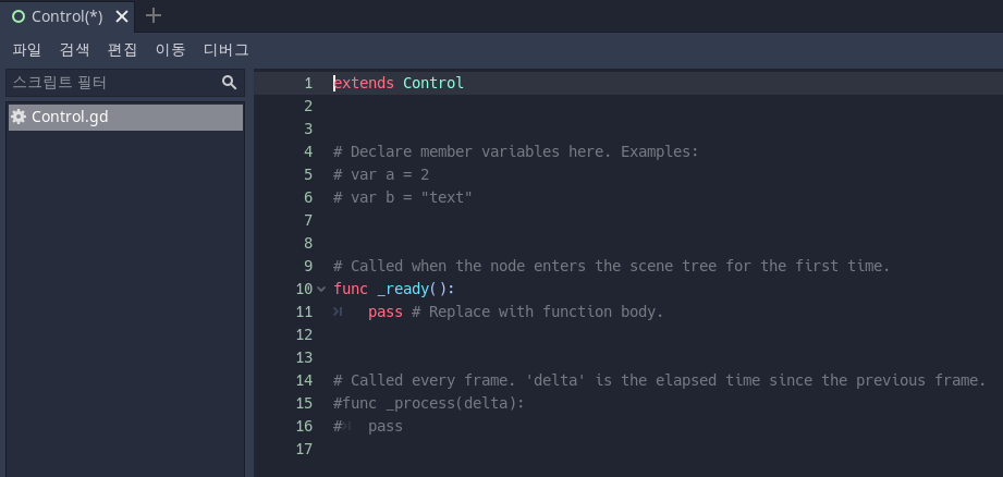 위의 그림은 자동으로 생성된 템플릿의 모습으로 노드 Control을 확장한다는 것을 알 수 있다. _ready()는 해당 노드와 모든 자식 노드들이 활성 씬으로 들어갈 때 호출되는 함수로 pass부분에 필요한 내용을 입력하면 된다. _process() 함수는 일단 주석처리 되어 있는데 앞의 #을 지우면 사용할 수 있다. 게임의 매 프레임마다 신호가 전달되는 함수다.
