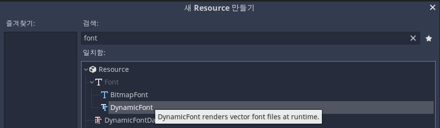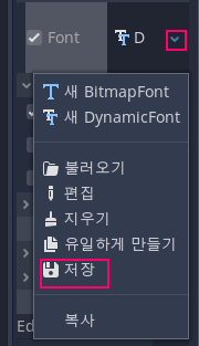 아직 폰트 리소스 파일을 제작하지 않았다면 위의 좌측 그림처럼 파일 시스템 창을 우측 마우스로 클릭하여 컨텍스트 메뉴>새 리소스를 선택하면 우측 그림과 같이 DynamicFont로 폰트 리소스를 추가할 수 있다. [저장]을 누르고 새 리소스 파일을 지정한다.