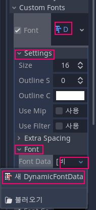 레이블이나 버튼 등 한글을 표시해야 할 노드의 인스펙터 창을 보면 "Custom Fonts" 항목이 있는데 "Font>새 DynamicFont"선택한다. 새로 생성된 동적 폰트를 클릭하면, 중앙의 그림처럼 동적 폰트의 상세한 설정을 할 수 있는데, "Settings>Font" 에서 Font Data를 클릭하고 새 동적 폰트 데이터 메뉴를 선택하고, 그다음에 생성된 폰트 데이터를 클릭하여 좌측의 그림처럼 폰트 경로 설정 항목에서 앞서 프로젝트 폴더에 복사한 폰트 파일을 선택하면 된다.