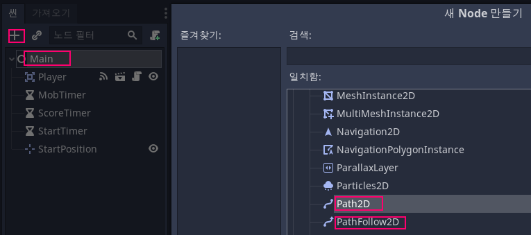 다음으로 필요한 작업은 괴물 타이머에 따라 괴물들을 주기적으로 만들어 주어야 하는데 화면의 네 방향에서 랜덤 하게 나오도록 해야 하는데 그 시작 지점을 화면의 좌상단 꼭짓점에서 시작하여 화면 둘레를 시계 방향으로 도는 경로 도상에서 랜덤 위치로 하는 것이다. 경로 정의는 루트 노드를 선택한 상태에서 자식 노드로 Node2D>Path2D 노드 유형을 추가하면 된다. 경로를 정의하는 노드를 추가했으면 경로를 따라 움직이며 캐릭터를 자동 회전시켜주는 Path2D>PathFollow2D 노드 유형을 우측의 그림과 같이 Path2D의 자식 노드로 추가한다. 노드의 이름은 각각 MobPath와 MobSpawnLocation으로 변경한다.