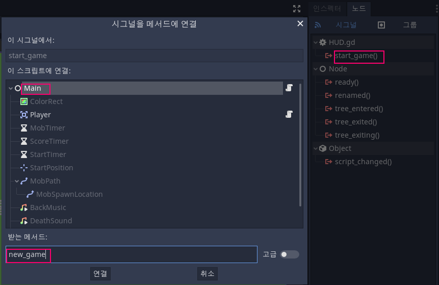 우선 HUD 씬에서 게임 시작 버튼을 누르면 발송하는 start_game() 시그널을 받을 처리 루틴을 앞서 작성해 놓은 new_game() 함수로 연결한다.