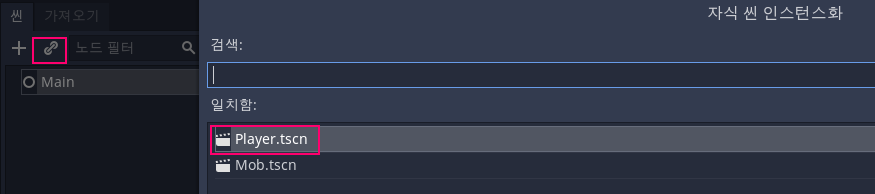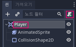 루트 노드를 선택한 상태에서 상단의 씬 파일을 노드로 인스턴스 하기를 클릭하고 플레이어 씬을 선택하여 플레이어 씬을 개체화한다. 씬 파일을 저장하고 다음으로 진행한다.