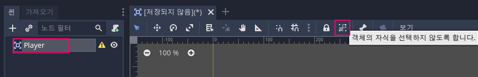 노드를 생성했으면 씬 창에서 노드의 이름을 더블클릭하여 이름을 수정하고 작업 공간 상단의 아이콘 중에서 자물쇠 모양의 잠금 버튼 우측에 있는 "객체의 자식을 선택하지 않도록 합니다"를 클릭한다. 이렇게 하면 루트 노드를 선택한 상태에서는 작업 공간에서 하위 노드의 객체를 클릭하더라도 선택되지 않으므로 작업의 혼란을 예방할 수 있다. 이 상태에서 하위 노드를 선택하려면 작업 공간이 아니라 좌측의 씬 창에서 해당 노드를 선택하고 작업하면 된다. 이 상태에서 일단 씬>씬 저장 메뉴나 Ctrl+S 단축키로 씬을 파일로 저장한다.