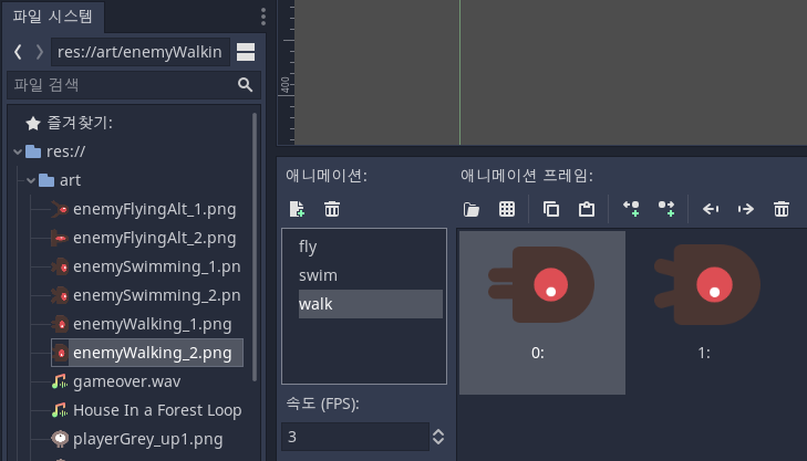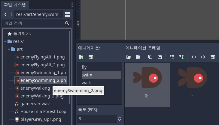 플레이어 씬에서 만들었던 애니메이션 제작 방법대로 괴물의 동작별 애니메이션을 제작한다. Mod 노드를 선택한 상태에서 새 노드 만들기를 클릭하여 Node2D>AnimatedSprite 노드 유형으로 자식 노드를 추가한다. 새 자식 노드가 추가되면 인스펙터 창에서 Frames 항목의 [비었음]을 클릭하고 "새 SpriteFrames"를 눌러서 애니메이션을 위한 준비를 한다. SpriteFrames를 클릭하여 작업 공간 하단에서 위의 그림들처럼 fly, swim, walk 애니메이션에 대한 이미지들을 설정한다. 플레이어와의 차이점은 초당 프레임 개수를 3으로 줄인 것이다. 괴물의 수가 많으므로 애니메이션으로 인한 성능 이슈가 없게 한다.