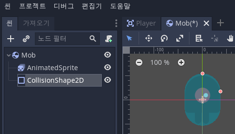 플레이어 씬에서 충돌 인식을 위해 추가한 것처럼 Mob 노드를 선택한 상태에서 "새 노드 만들기"를 클릭하여 Node2D>CollisionShape2D 유형의 노드를 자식 노드로 추가하고 인스펙터 창에서 Shape 항목의 [비었음]>새 CapsuleShape2D를 선택하여 캡슐 모양의 영역을 선택한다. 주황색 원으로 표시되는 두 개의 핸들을 끌어다 놓기 방식으로 캐릭터가 감싸 지도록 영역의 크기를 조정한다.