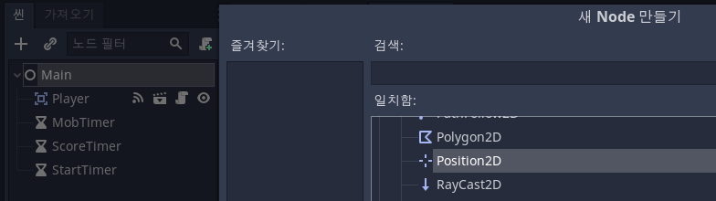 메인 씬에는 타이머 3개가 필요한데 위의 그림처럼 루트 노드를 선택한 상태에서 자식 노드 추가 버튼을 클릭하고 Timer 노드 유형을 선택하는 것으로 타이머 노드 3개를 추가한다. 괴물을 주기적으로 발생시킬 MobTimer(0.5 초 간격), 괴물을 피한 시간을 점수로 계산할 ScoreTimer(1초 간격), 게임을 시작하면 처음에 잠시 대기 시간을 주기 위한 StartTimer(3초)를 생성하며 각 노드를 생성하고 인스펙터의 "Wait Time"에 시간을 초 단위로 설정한다. 다른 타이머들은 한 주기가 끝나고 다음 주기가 이어지지만 게임 시작 타이머의 경우에는 한 번만 수행할 것이므로 "One Shot" 속성을 체크해 준다. 타이머 노드를 여러 개 생성할 때는 노드 유형이 같으므로 노드 복제(Ctrl+D 단축키) 기능을 사용하면 편리하다. 플레이어를 개체화하고 타이머를 추가한 이후의 메인 씬은 우측의 그림과 같다.