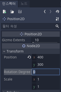 플레이어의 시작 위치를 지정하기 위해서 좌측의 그림처럼 Position2D 노드 유형으로 자식 노드를 추가하고 우측의 그림처럼 인스펙터 창에서 Position에 플레이어의 시작 위치를 앞서 설정한 프로젝트의 화면 크기의 중앙으로 설정한다.