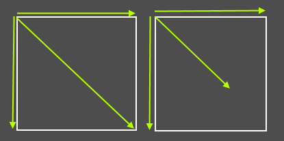 좌측 그림의 경우 velocity.normalized()를 수행하지 않을 경우의 움직임으로 수평, 수직 방향으로 동시에 움직이는 경우가 수평만 또는 수직으로만 움직이는 것보다 많은 거리를 이동한다. 그러나, velocity.normalized()를 수행하면 우측 그림처럼 대각선 방향의 움직임도 동일한 양으로 움직이게 된다.