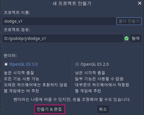 프로젝트를 생성하면 프로젝트>프로젝트 설정 메뉴를 선택하여 위의 그림과 같이 Display>Window 에서 창의 크기와 창 크기가 바뀔 때 어떻게 처리할지를 선택한다. 예제에서는 모드를 2d로 Aspect를 keep로 선택하여 가로, 세로 비율을 유지하도록 했다.