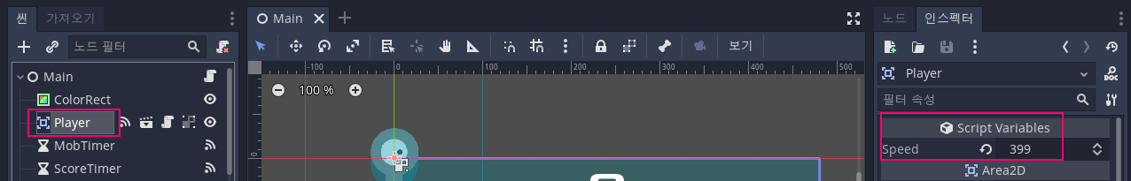 위의 그림을 보면 Player 노드를 클릭하면 인스펙터 창에서 내보내기 한 speed를 스크립트 변수 영역에서 수정할 수 있음을 확인할 수 있다. 변경한 내용은 클래스 자체에는 영향을 주지 않고 인스턴스에만 적용된다.