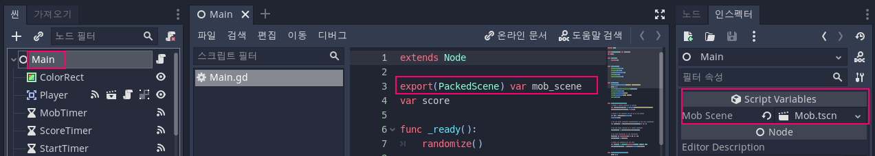 클래스 변수 앞에 export 키워드를 붙이면 고도 편집기 인스펙터 창의 스크립트 변수 섹션에서 해당 값을 수정할 수 있게 해 준다. 클래스 자체는 바꾸지 않으면서 인스턴스에만 해당 값을 적용한다. 변수 내보내기를 할 때는 위의 예제처럼 상수로 초기화하거나 export(힌트 표현)와 같이 어떤 타입으로 값을 입력받을지를 알려주어야 한다.
