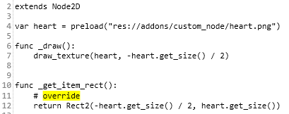 특정한 클래스를 상속받는 클래스에서는 부모 클래스에 있는 동일 이름의 함수를 재정의하여 부모 클래스의 함수를 대체할 수 있다. 이를 오버라이딩한다. 위의 그림에서는 Node2D의 _get_item_rest를 재정의하고 있다. 이처럼 부모 클래스와 자식 클래스에 동일한 이름의 함수가 있을 때 자식 클래스에서 부모 클래스의 함수를 호출할 경우에는 함수 이름 앞에 .을 붙인다. 위의 예제에서는 ._get_item_rest() 라고 호출하면 된다.