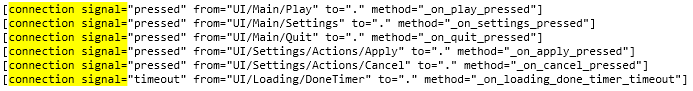 이렇게 연결하는 시그널 연결의 경우에는 수신 함수는 스크립트 파일에 작성하지만 connect문은 스크립트 내에 포함되지 않고 위의 파일 내용처럼 씬 파일내에 connection 으로 기술된다.