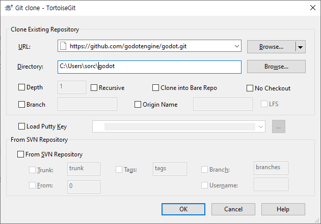 위의 그림처럼 git clone https://github.com/godotengine/godot.git을 수행하여 고도 최신 코드를 내려받는다. 만약 안정화 버전으로 작업하려면 git clone https://github.com/godotengine/godot.git -b 3.4.4-stable 처럼 지정하면 된다. 필자는 안정화 버전으로 내려받았다.(Branch 체크하고 3.4.4-stable 입력)