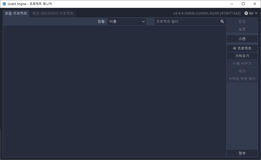 위의 그림은 빌드한 godot.windows.opt.tools.64.exe를 수행한 화면이다.