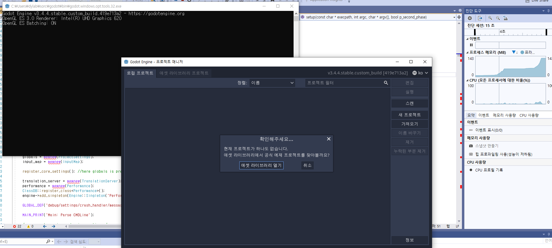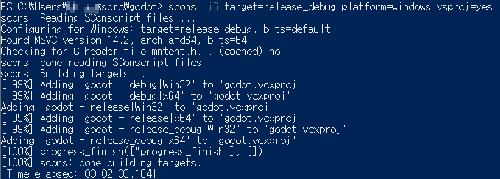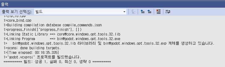 위의 그림처럼 scons 소스 빌드 명령 뒤에 "vsproj=yes"를 붙여주면 비주얼 스튜디오에서 엔진의 소스 코드도 열고 빌드도 할 수 있다.