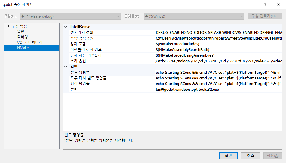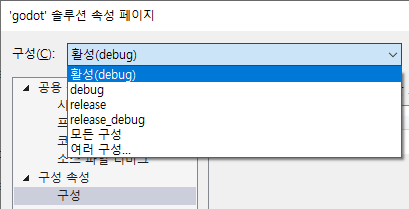 비주얼 스튜디오에서 빌드하더라도 빌드는 스콘을 활용하기 때문에 솔루션 구성 속성도 debug, release, release_debug 로 지정해서 빌드할 수 있다.