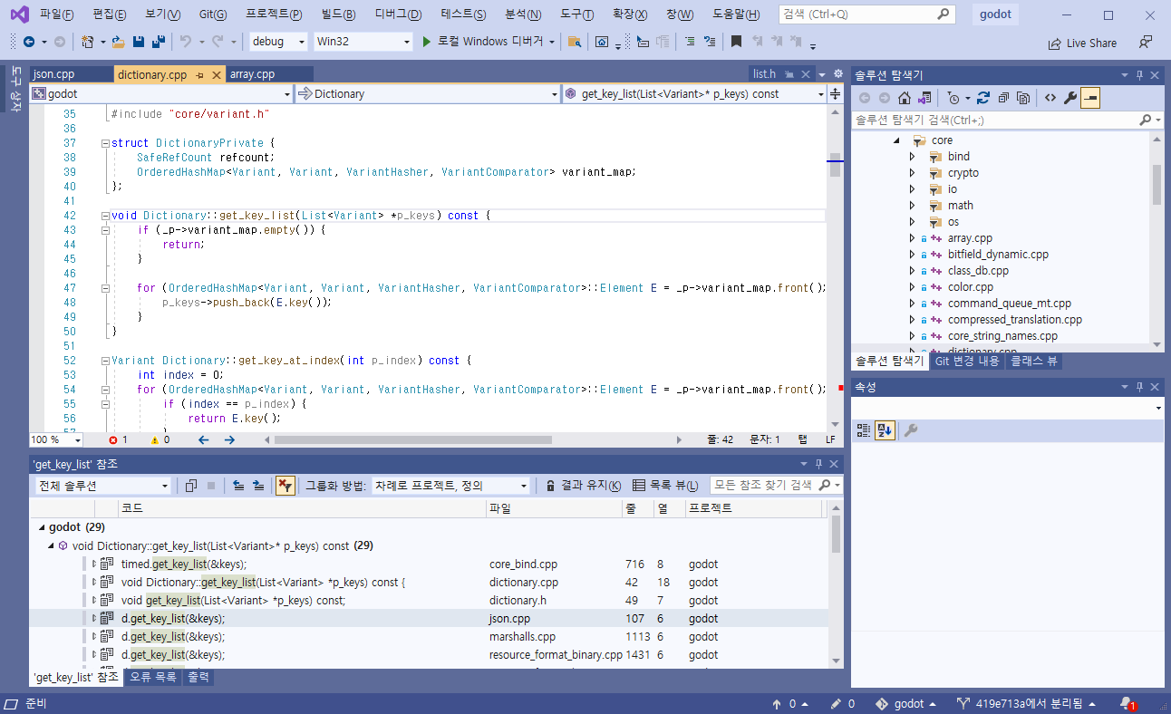 소스 폴더에 보면 위의 그림과 같이 솔루션 파일과(godot.sln) 프로젝트 파일들을(*.vcxproj) 확인할 수 있고 비주얼 스튜디오로 솔루션 파일을 열어서 엔진 개발을 진행할 수 있다.