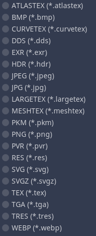 통상 프로젝트 리소스 중에서 불러오기를 하는데 bmp, jpg, jpeg, png, svg, svgz, tga를 비롯한 다양한 비트맵 이미지와 벡터 이미지를 지원하고 스프라이트 시트라고 부르는 아틀라스 텍스처 등도 지원한다.